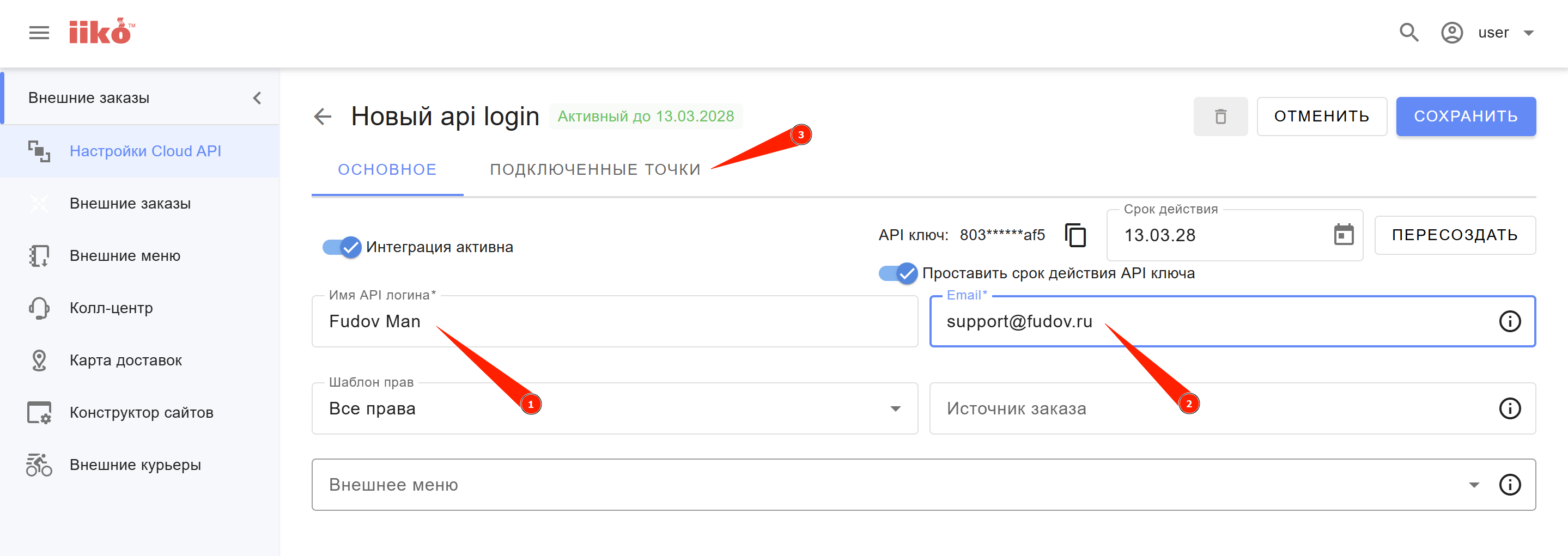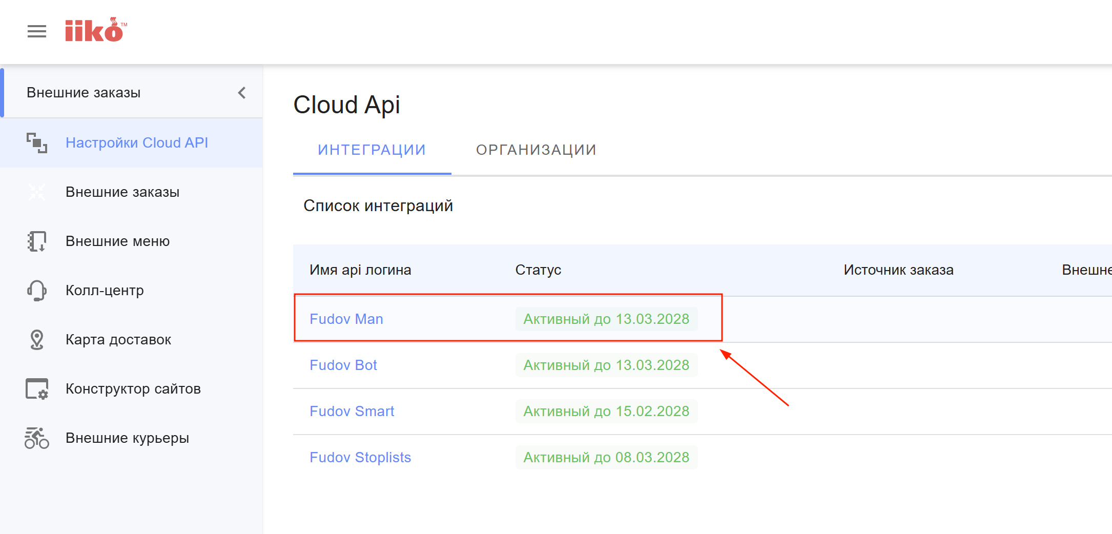 API логин iikoCloud для подключения курьерского приложения Fudov Man: