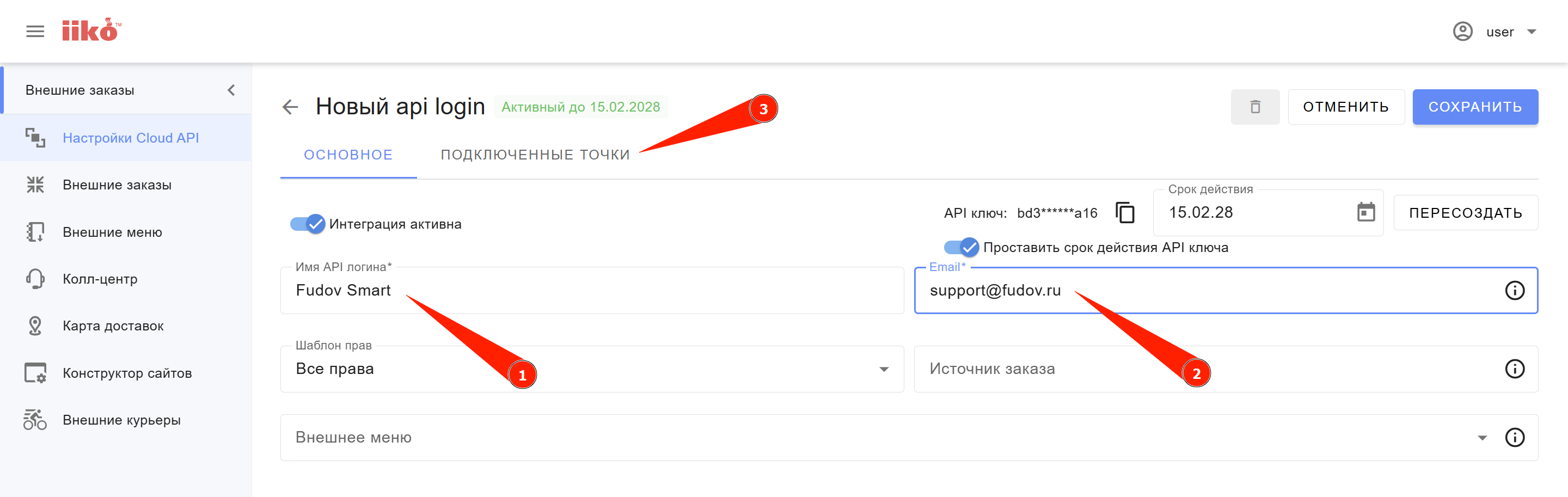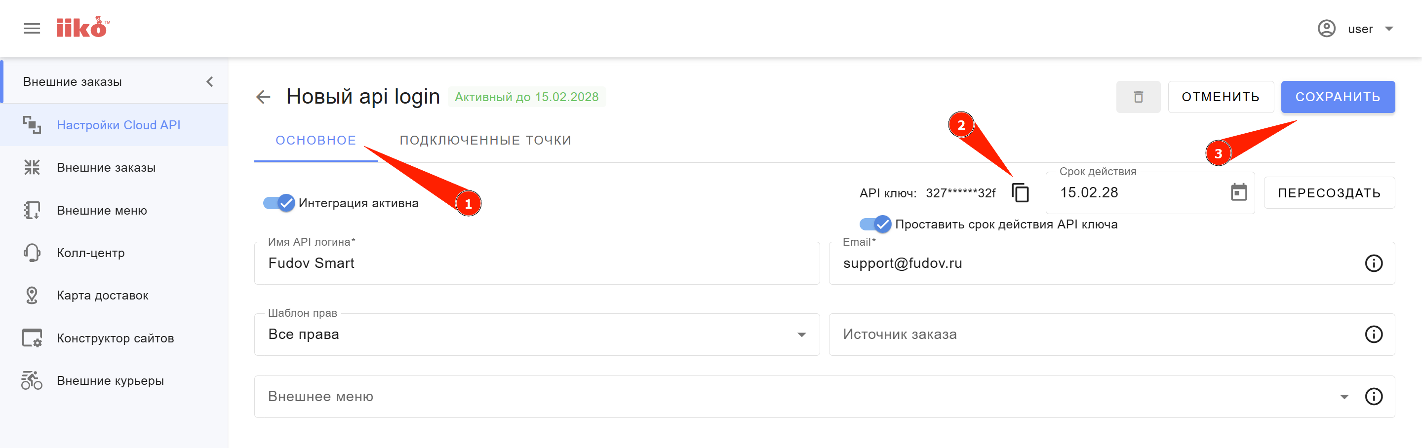 API логин iikoCloud для подключения сервисов Fudov: