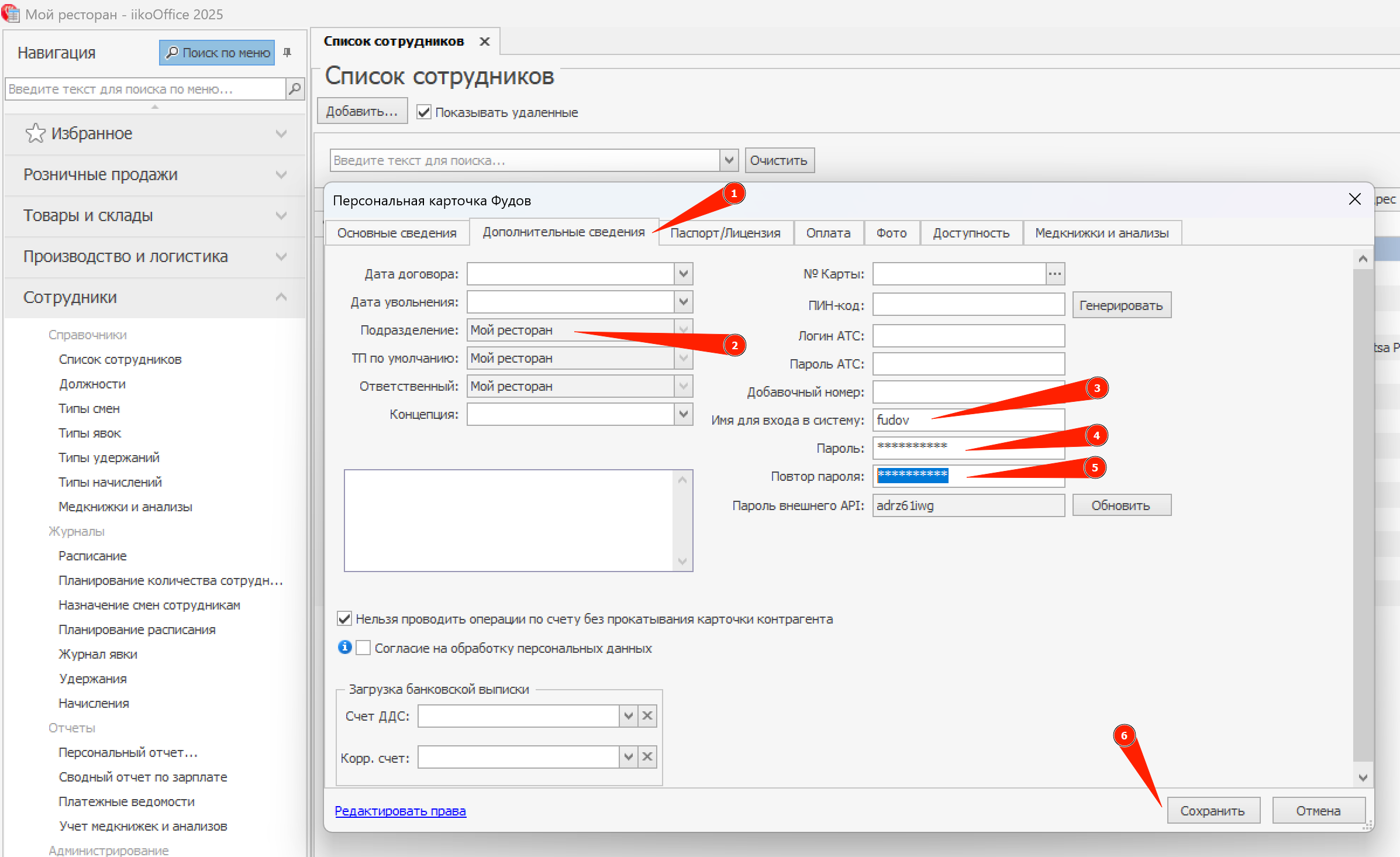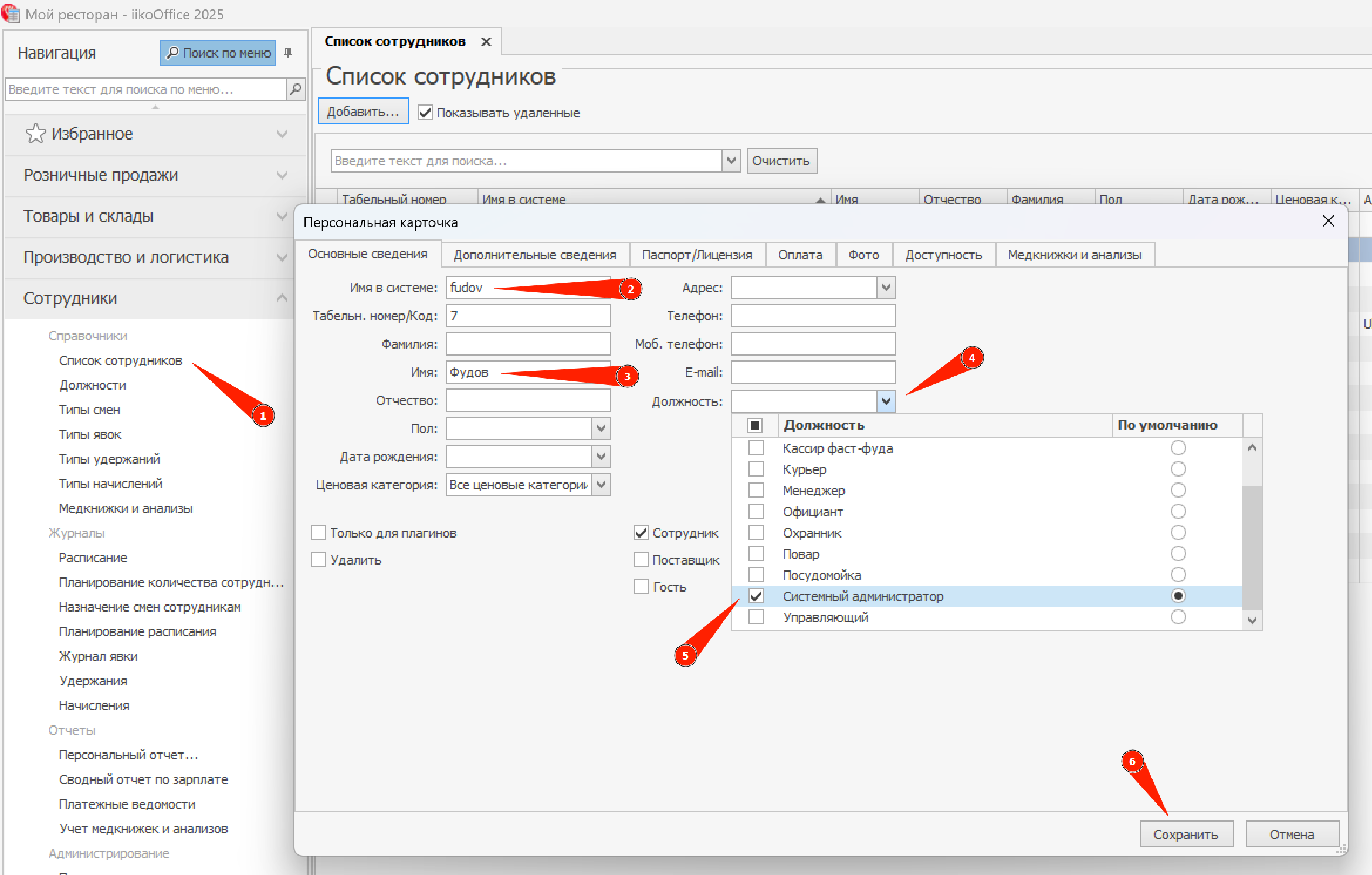 Шаг 2. Создайте сотрудника Фудов в бэк-офисе iiko¶