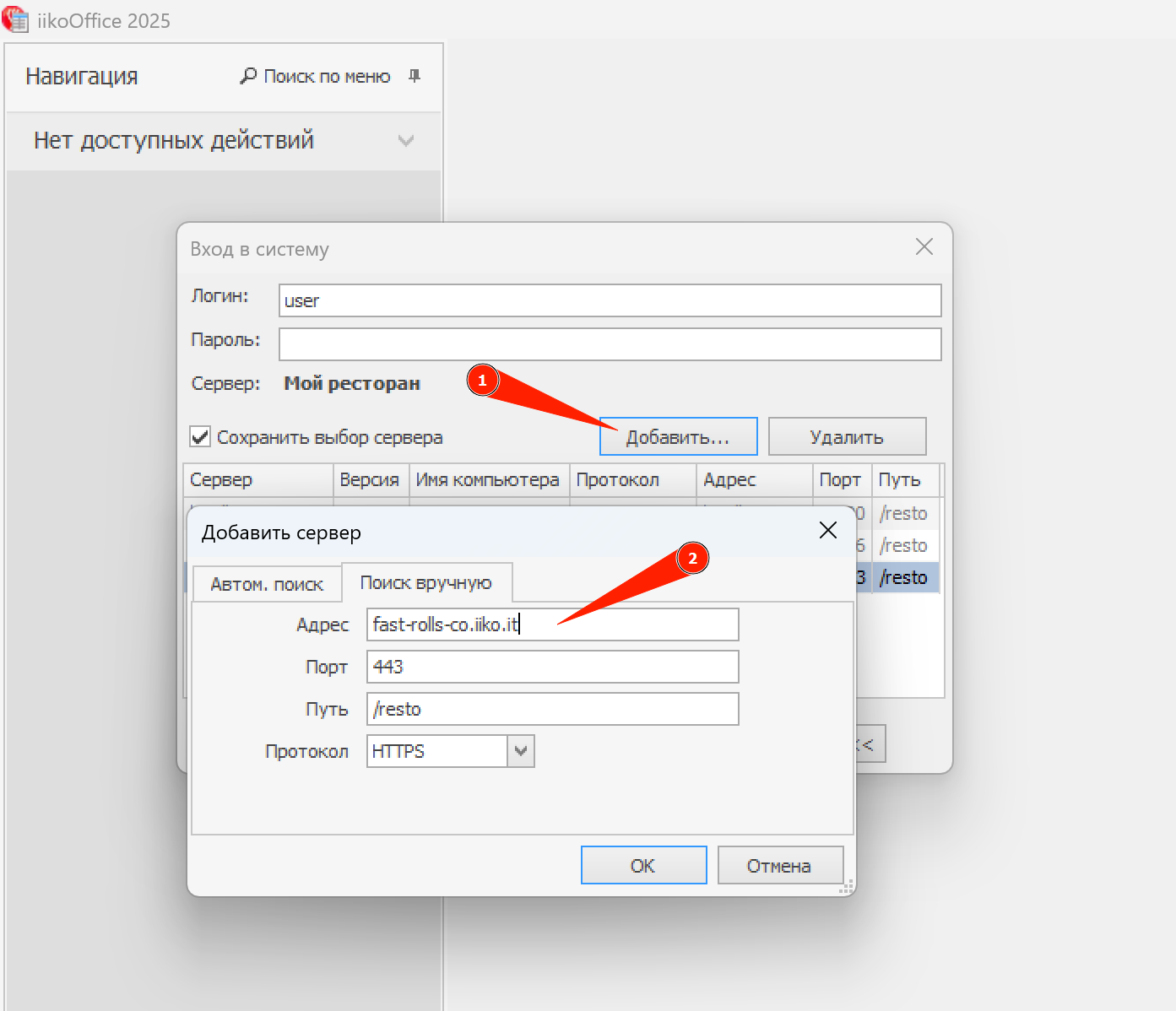 Войдите в бэк-офис iiko (iikoOffice). Сохраните адрес сервера — он потребуется нам для подключения.