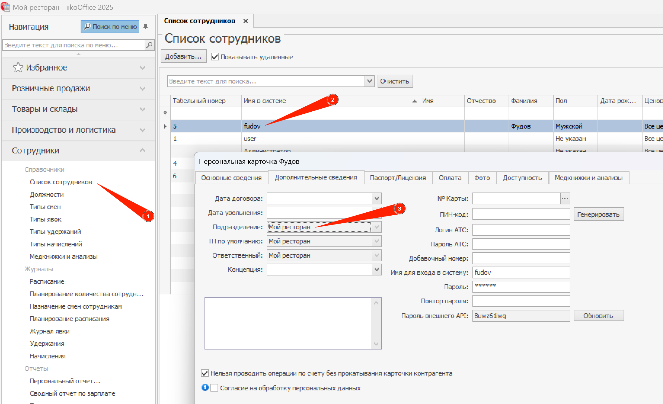 В бэк-офисе iiko (iikoOffice) в левом меню откройте Сотрудники → Список сотрудников, выберите сотрудника fudov, двойным кликом откройте его персональную карточку и на вкладке Дополнительные сведения в поле Подразделение отметьте видимость новой точки, затем сохраните изменения.